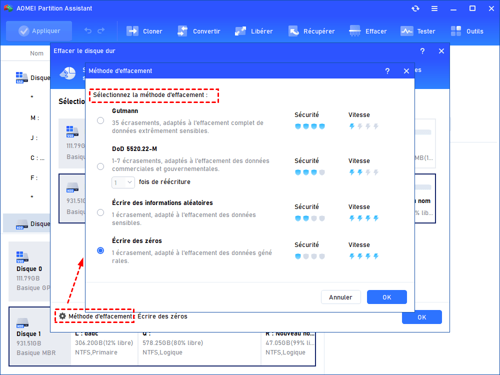 • Écrire des zéros : Écrase tous les secteurs avec des zéros. Cette méthode est sécurisé et rapide, souvent utilisée pour effacer les disques durs personnels.