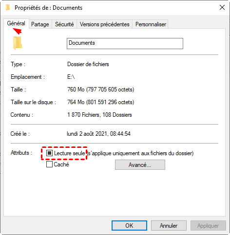 2. Dans l’onglet "Général", décochez l’option "Lecture seule" si elle est activée.