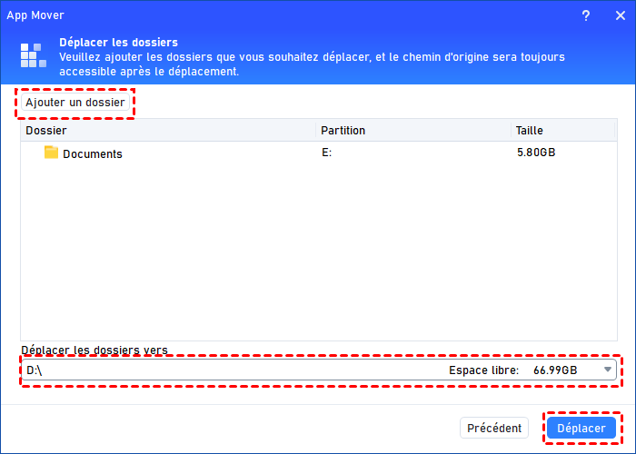 3. Ajoutez les dossiers à déplacer et indiquez le disque de destination en sélectionnant un emplacement avec suffisamment d’espace libre.