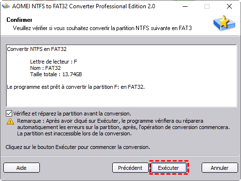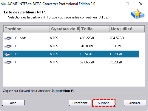 - Il peut convertir directement une partition NTFS en FAT32 sans formatage, donc sans perte de données.