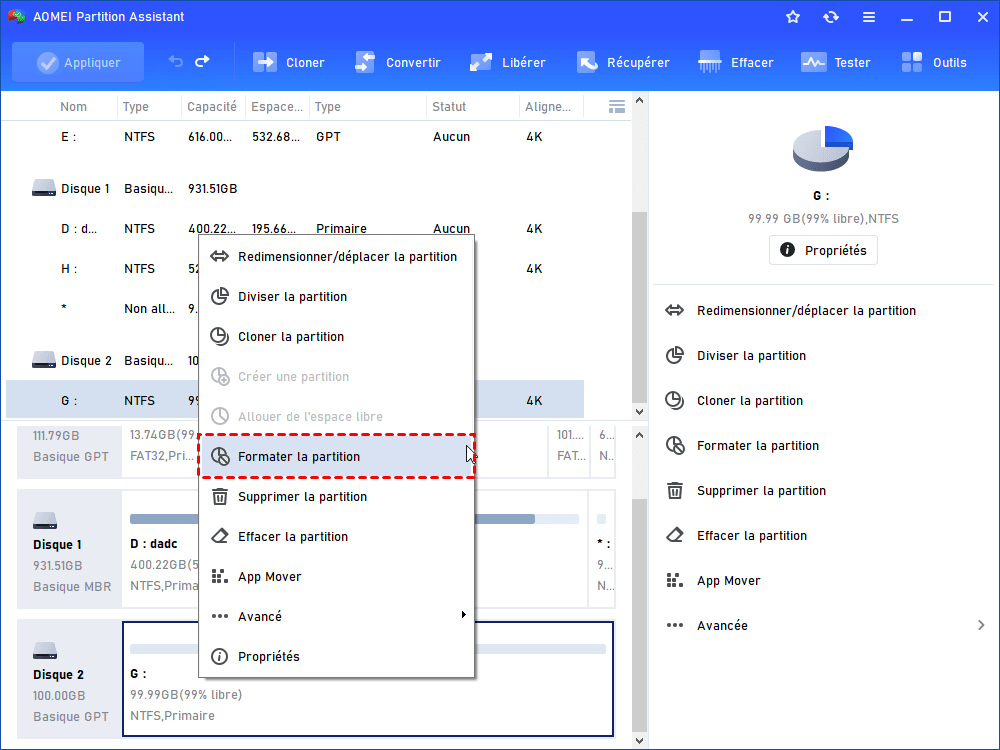 Étape 1. Faites un clic droit sur la partition concernée et choisissez « Formater la partition ».