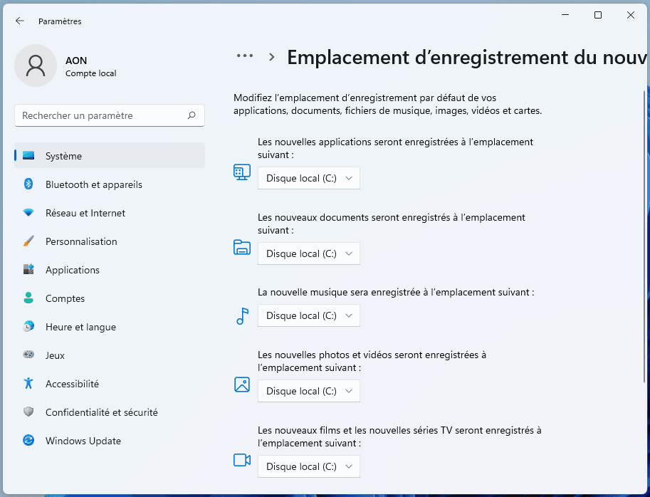Étape 3 : Sous « Les nouvelles applications seront enregistrées à l'emplacement suivant : », choissez un autre disque.