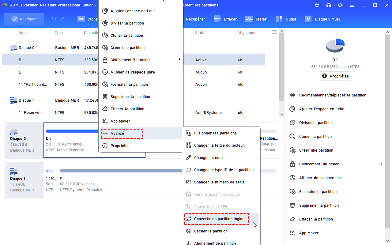2. Faites un clic droit sur la partition que vous souhaitez convertir, dans Avancé, choisissez Convertir en partition primaire/logique.