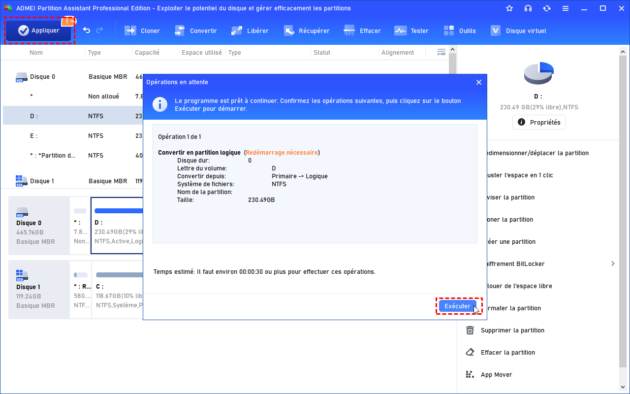 4. Validez en cliquant sur Appliquer, puis cliquez sur Exécuter pour lancer l’opération et finaliser le formatage.