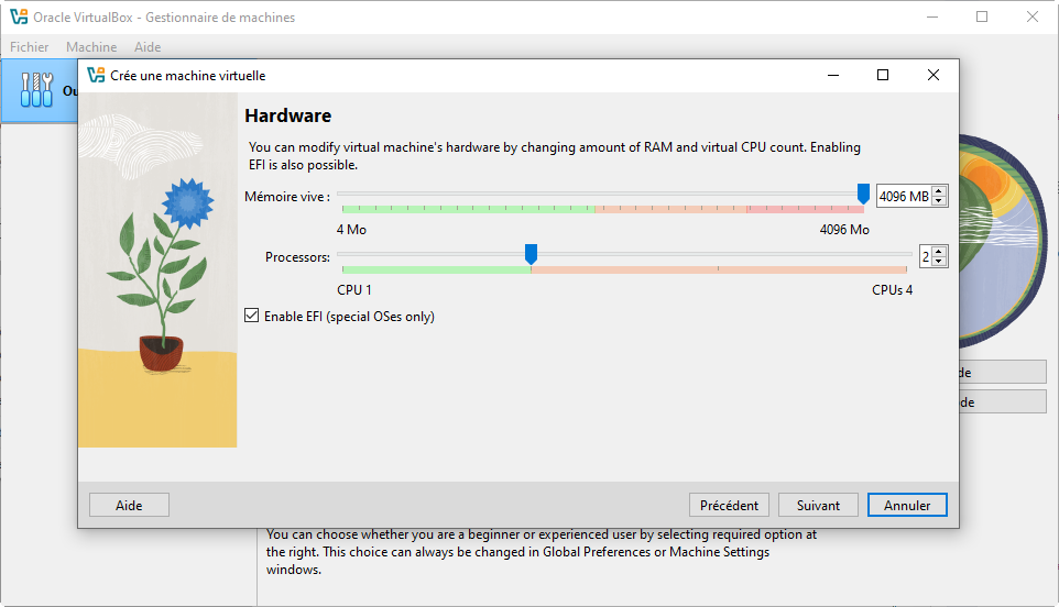 3. Définissez la quantité de mémoire RAM à allouer en utilisant le curseur et sélectionnez le nombre de processeurs à attribuer à la machine virtuelle, en laissant au minimum un cœur libre pour Windows hôte afin d’éviter les ralentissements.