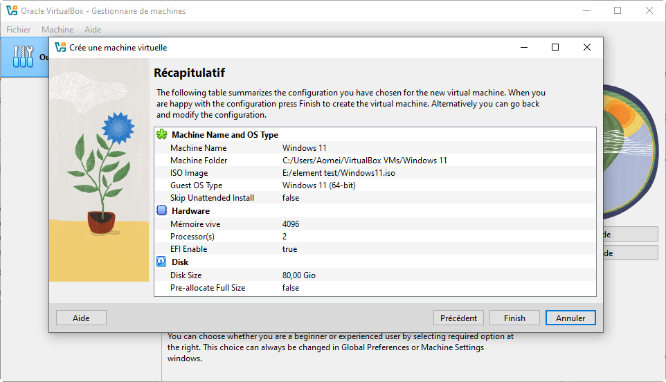 5. Vérifiez les informations dans Récapitulatif, cliquez sur Terminer pour lancer la machine virtuelle, puis suivez l’installation de Windows comme sur un PC classique en choisissant les options adaptées à votre usage.
