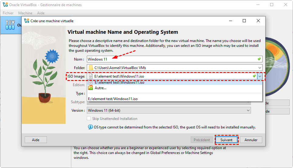 2. Choisissez le dossier de la machine virtuelle et sélectionnez le fichier ISO de votre système Windows. Sélectionnez Microsoft Windows comme type, puis choisissez la version exacte de Windows dans la liste afin que VirtualBox applique automatiquement les paramètres adaptés.