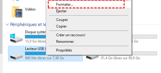 1. Branchez votre clé USB sur l’ordinateur et ouvrez l’Explorateur de fichiers. Faites un clic droit sur la clé USB dans Ce PC/Poste de travail et sélectionnez Formater.
