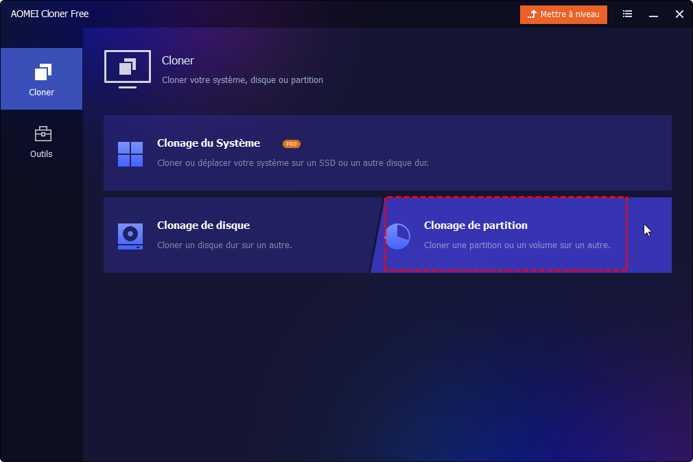 1. Installez AOMEI Cloner sur votre ordinateur, puis ouvrez le logiciel. Dans le menu principal, sélectionnez Clonage de partition pour démarrer l’opération.