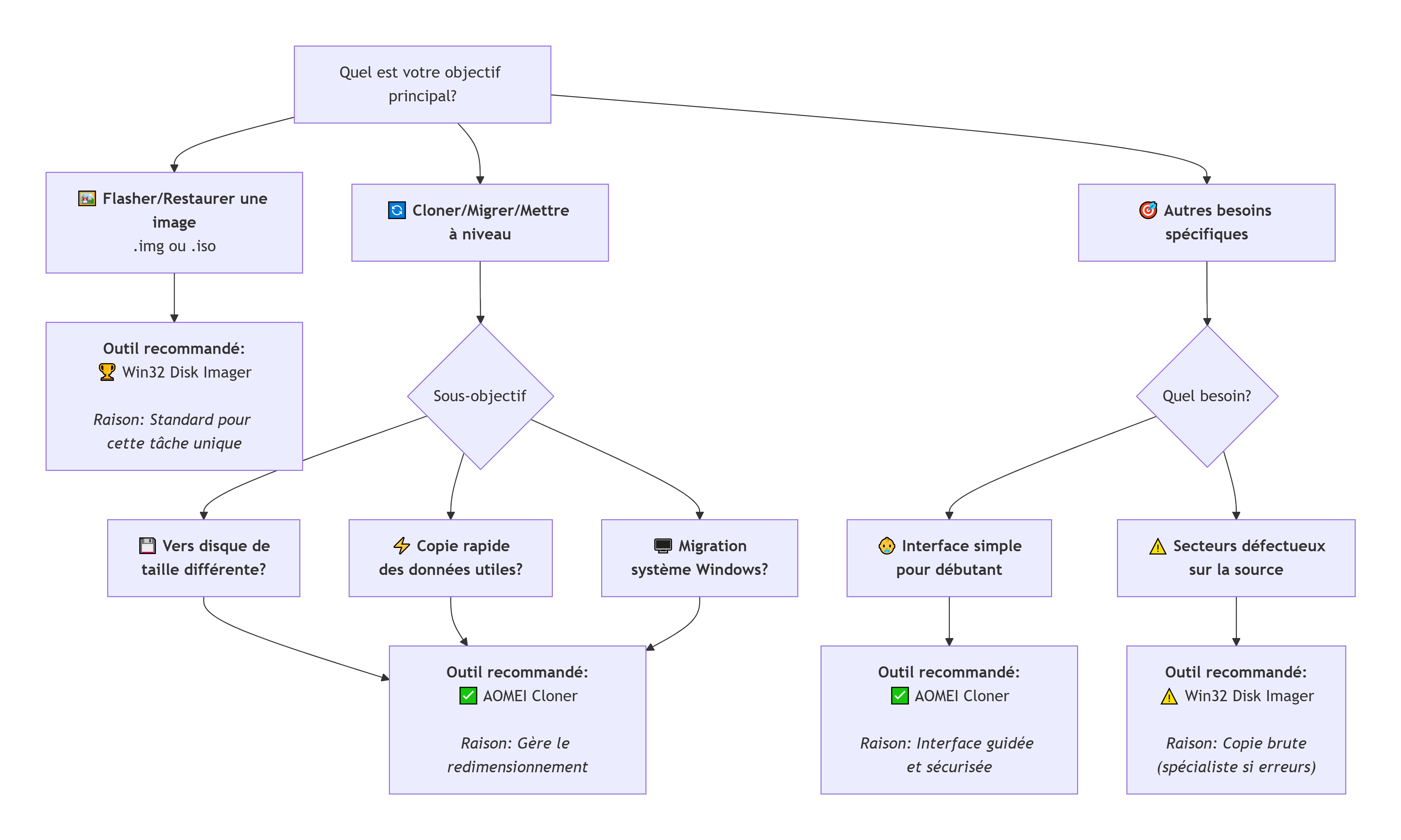 | Interface | Très basique, technique, peu guidée (risque d'erreur de lecteur). | Moderne, visuelle, guidée étape par étape, avec résumé avant validation. | AOMEI pour simplicité. |