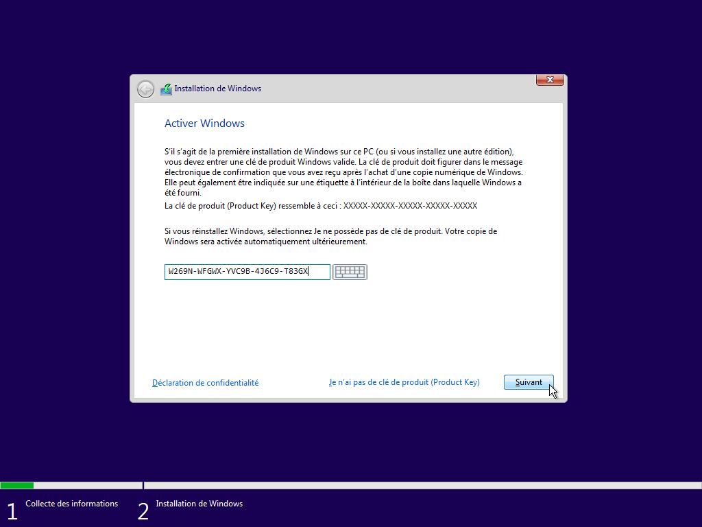 1. Installez Windows 10 normalement sans entrer de clé produit.
