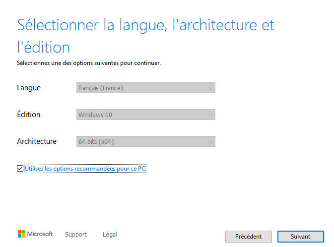 3. Sélectionnez la langue, l’édition et l’architecture (64 bits recommandé), puis choisissez de créer un fichier ISO ou une clé USB bootable.