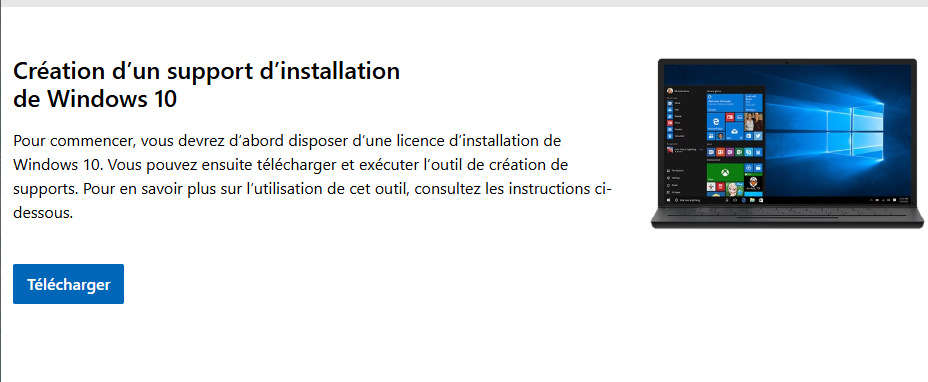1. Rendez-vous sur le site officiel de Microsoft et téléchargez l’outil Media Creation Tool en cliquant sur le bouton prévu pour créer un support d’installation.