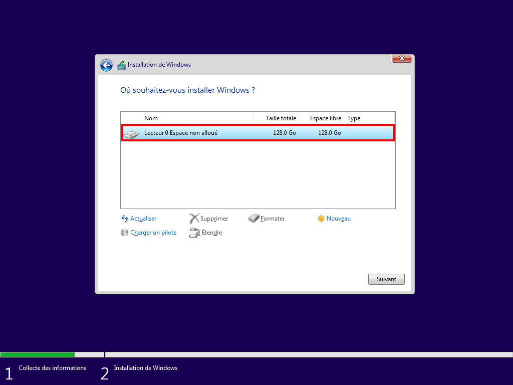 9. Sélectionnez le disque vierge, supprimez les partitions existantes si nécessaire, puis cliquez sur « Suivant » pour que Windows crée les partitions automatiquement.