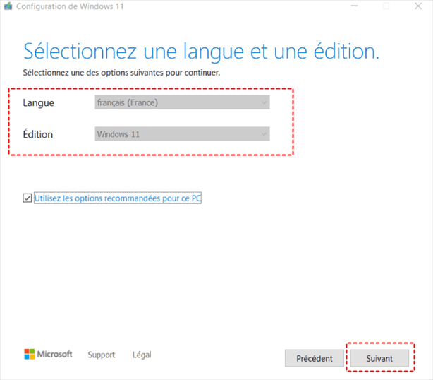 3. Sélectionnez la langue, l’édition et l’architecture, puis laissez l’outil préparer la clé de démarrage.