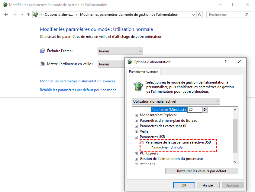 Accès rapide : Panneau de configuration → Options d'alimentation → Modifier les conditions de mise en veille de l'ordinateur → Paramètres d'alimentation avancés → USB → Désactiver la suspension sélective USB.