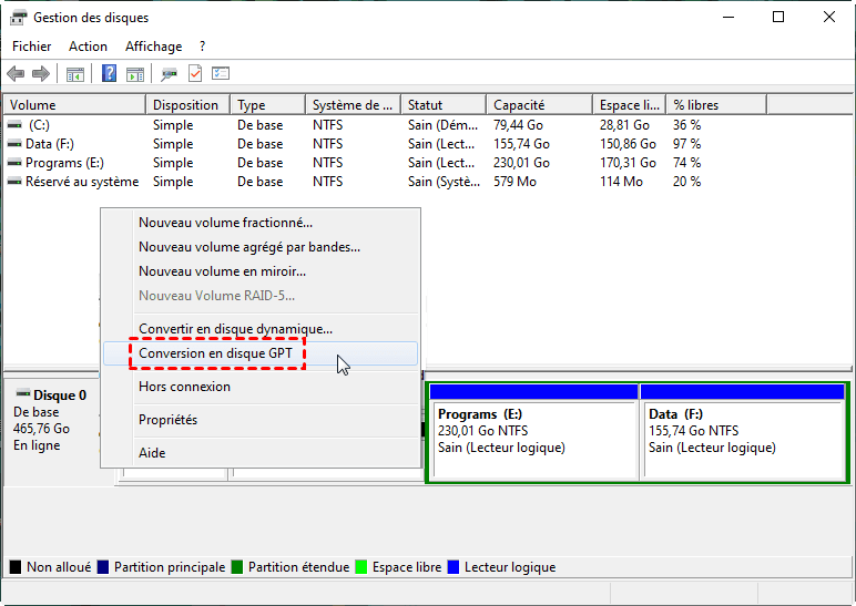 Windows propose des outils pour convertir le type de disque, vous pouvez par exemple utilisez l'outil Gestion des disques intégré à Windows. Elle est très rapide et simple, mais elle efface toutes les données du disque (fichiers, programmes et éventuel système d'exploitation). Elle convient donc uniquement si vous souhaitez repartir de zéro avec un disque vide, ou s'il s'agit d'un disque de données que vous pouvez formater sans conserver son contenu.