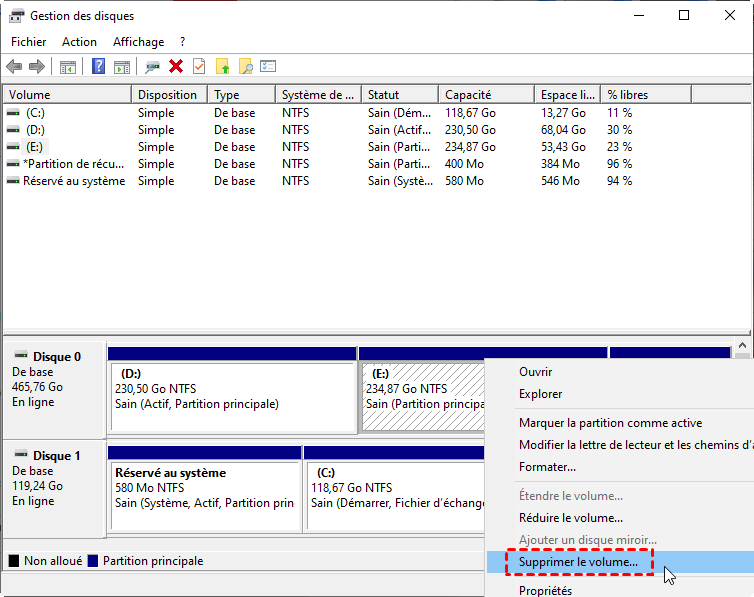 3. Faites un clic droit sur chaque partition (volume) du disque et choisissez Supprimer le volume. Répétez jusqu'à ce que le disque apparaisse entièrement comme "Non alloué".