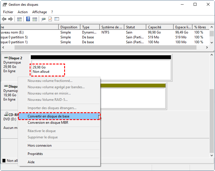 Conversion vers disque de base : Pratique si votre disque est dynamique et que vous voulez revenir à un état compatible Windows, attention à la suppression des données. Vous pouvez