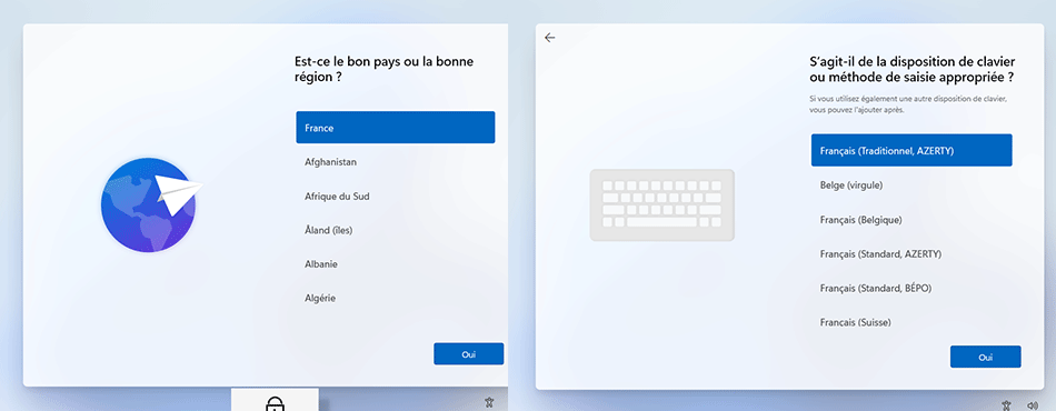 Langue, pays et disposition du clavier : Ces trois paramètres déterminent le format de la date, de l’heure, de la monnaie ainsi que le comportement de votre clavier. Sélectionnez-les avec précision. Un mauvais choix peut entraîner un clavier décalé ou un affichage régional inadapté.
