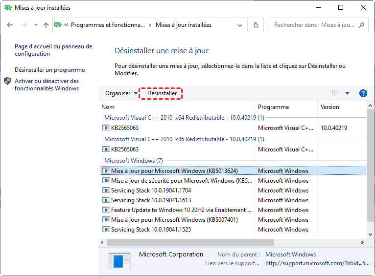 2. Cliquez sur Désinstaller des mises à jour pour voir les dernières installations.