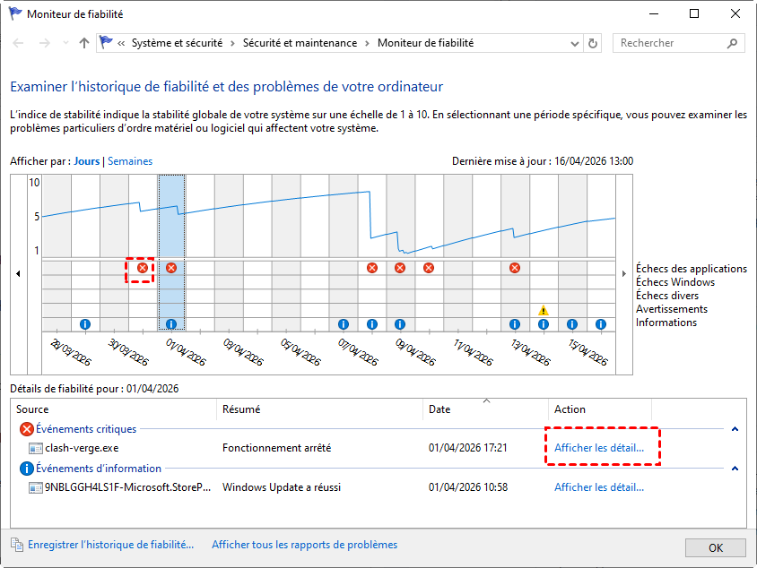 Cet outil est le plus simple pour commencer. Il affiche une vue claire de l’historique des erreurs et permet de repérer rapidement les jours où votre PC a crash.