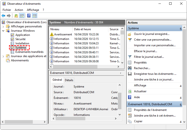 2. Allez dans Journaux Windows puis cliquez sur Système pour afficher les événements liés au fonctionnement du PC.