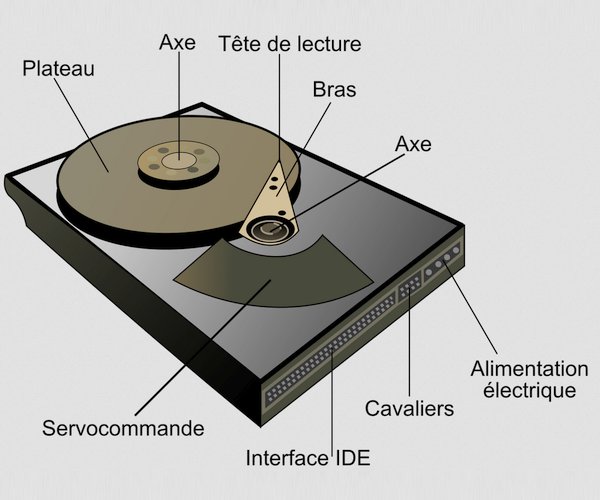 - Servocommande : Elle contrôle et guide les têtes de lecture avec une extrême précision afin de localiser rapidement les données sur les plateaux.