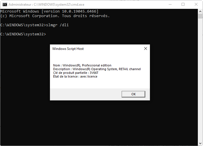 slmgr /dlipuis validez pour afficher le type de licence.
