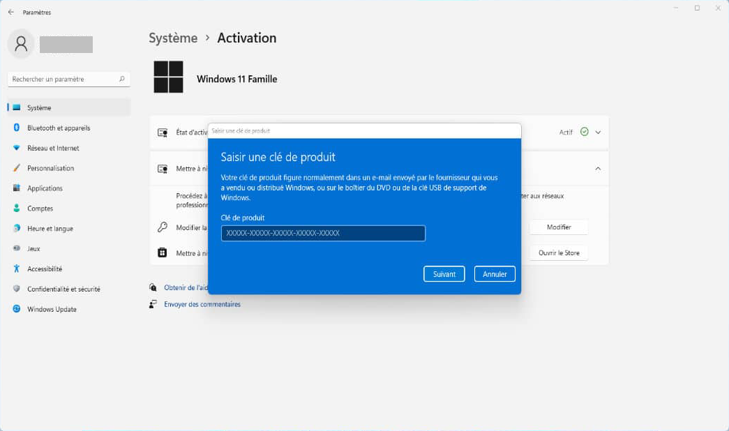 3. Entrez la clé Windows 11 Retail et laissez Windows procéder à l’activation en ligne.