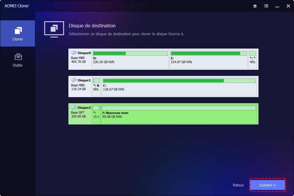 3. Choisissez le nouveau disque cible qui sera utilisé en GPT et vérifiez que l’espace est suffisant.