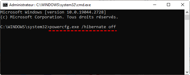 Étape 2 : Dans l’invite de commande, tapez powercfg.exe /hibernate off et appuyez sur Entrée. Les fichiers d’hibernation seront supprimés automatiquement.