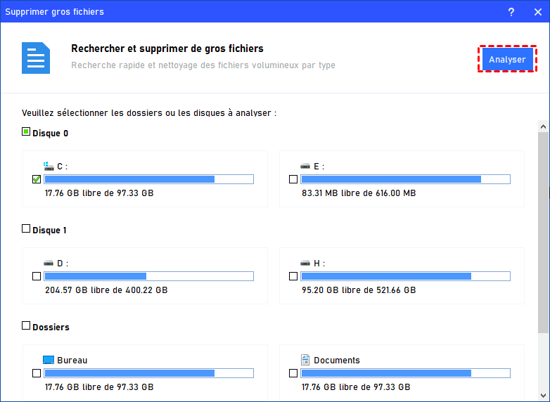 Dans la fenêtre qui s’affiche, choisissez les partitions ciblées, puis cliquez sur Analyser pour lancer la recherche des fichiers occupant beaucoup d’espace.