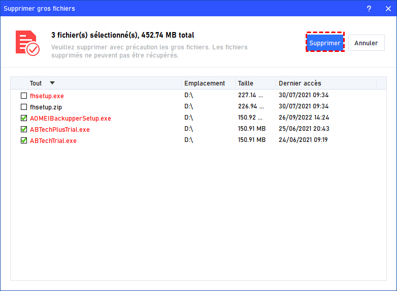 Après avoir vérifié la liste des fichiers cochés, cliquez sur Supprimer pour lancer la suppression.