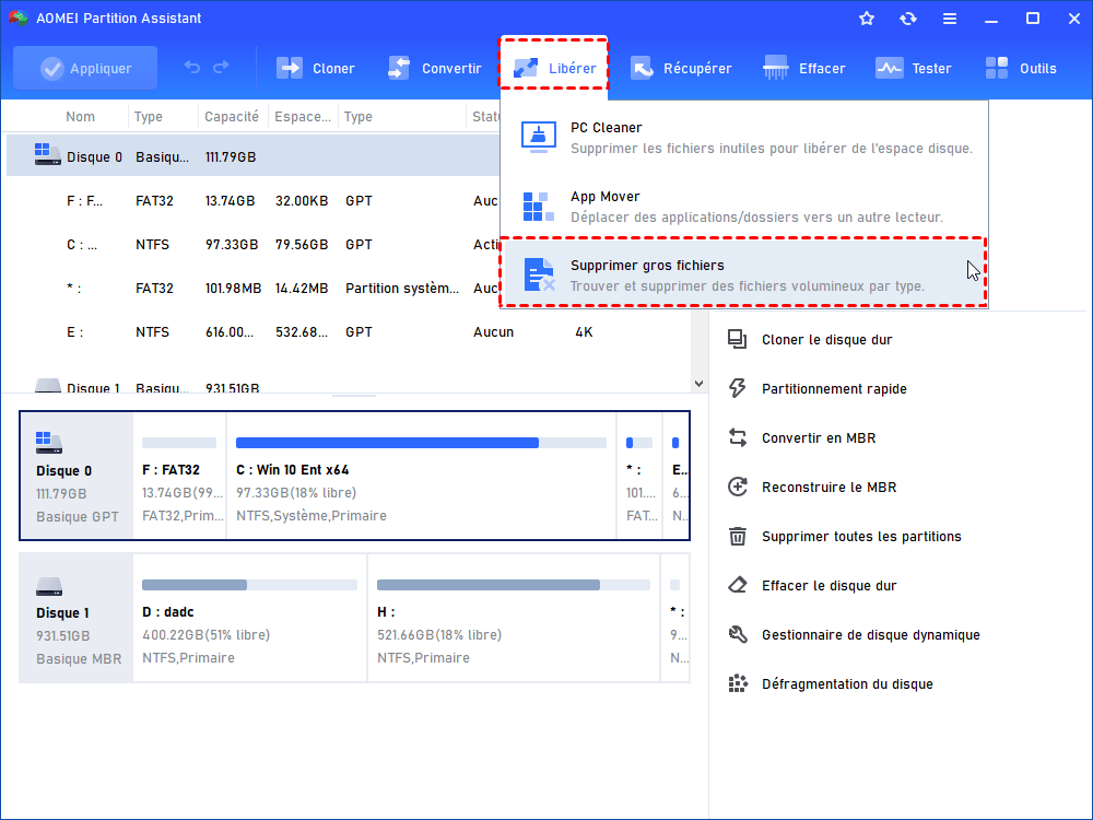 Voici les étapes pour supprimer des fichiers volumineux avec AOMEI :