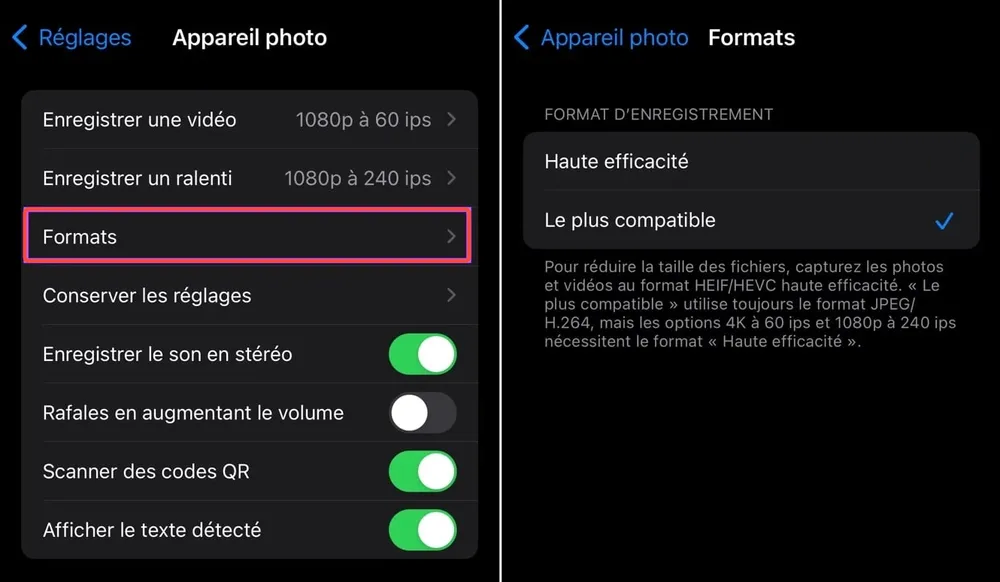 - Convertir en JPEG : c'est la solution la plus universelle vous pouvez convertir vos images pour les rendre compatibles partout ou changer les réglages de votre iPhone via Réglages > Appareil photo > Formats > Le plus compatible.