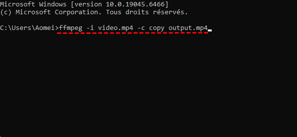 3. Entrez une commande de type : ffmpeg -i video.mp4 -c copy output.mp4.