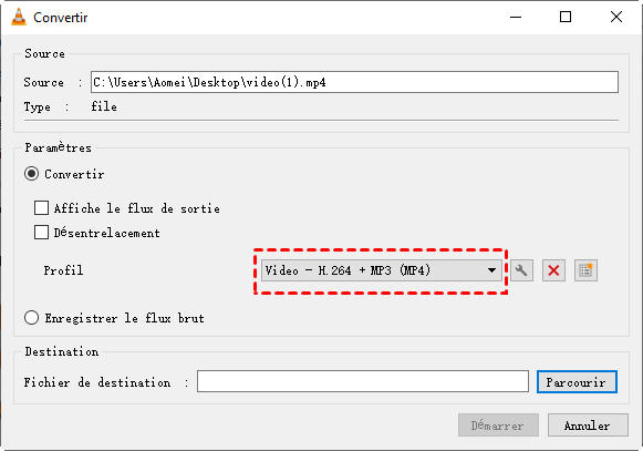 3. Choisissez le format MP4 et activez la réparation automatique si VLC vous la propose.