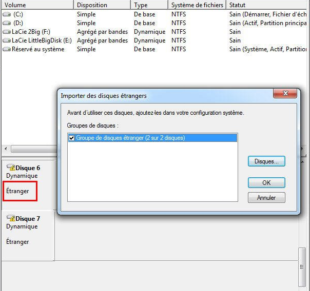 3. Importez le disque si Windows l’indique comme disque étranger. Faites un clic droit sur le disque concerné puis sélectionnez Importer des disques étrangers afin que Windows reconstruise la configuration du volume.