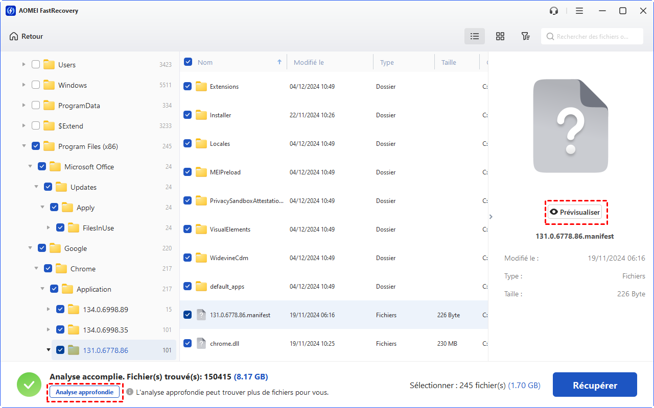 2. Lancez l’analyse et patientez pendant que le logiciel recherche les fichiers récupérables. Vous pouvez cliquez sur le fichier trouvé et utiliser Prévisualiser pour vérifier l'intégrité de fichier. Si vous n'avez pas trouvé le fichier, effectuez une Analyse approfondie pour une recherche plus complète.