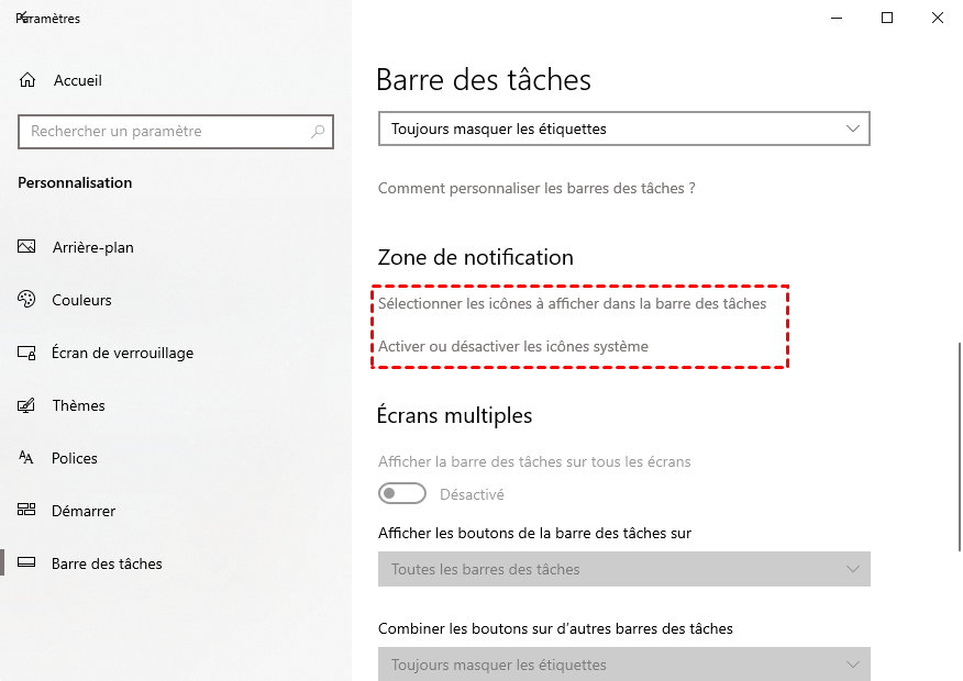 1. Ouvrez les Paramètres puis allez dans Personnalisation et cliquez sur Barre des tâches. Ensuite, dans les paramètres de la partie Zone de notification, vérifiez si l'icône d'éjection est activée.