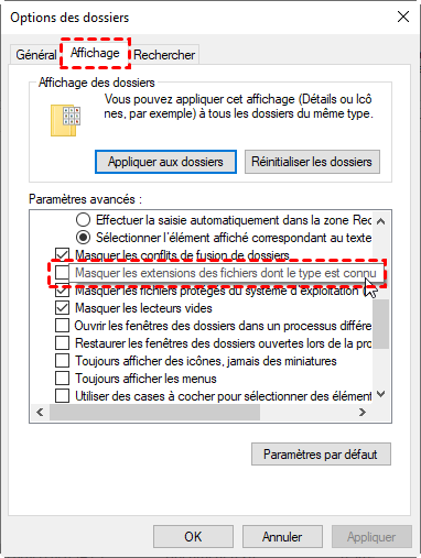 3. Cliquez sur "Options", puis "Modifier les options des dossiers et de recherche", allez dans l’onglet "Affichage" et décochez "Masquer les extensions des fichiers dont le type est connu" pour mieux identifier les fichiers.
