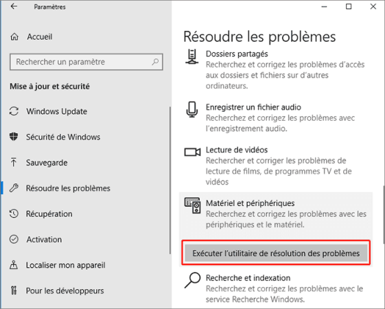 2. Faites défiler la liste jusqu’à "Matériel et périphériques", cliquez dessus, puis sur "Exécuter l’utilitaire de résolution des problèmes" (sur Windows 11, cliquez d’abord sur "Utilitaires supplémentaires de résolution de problèmes").